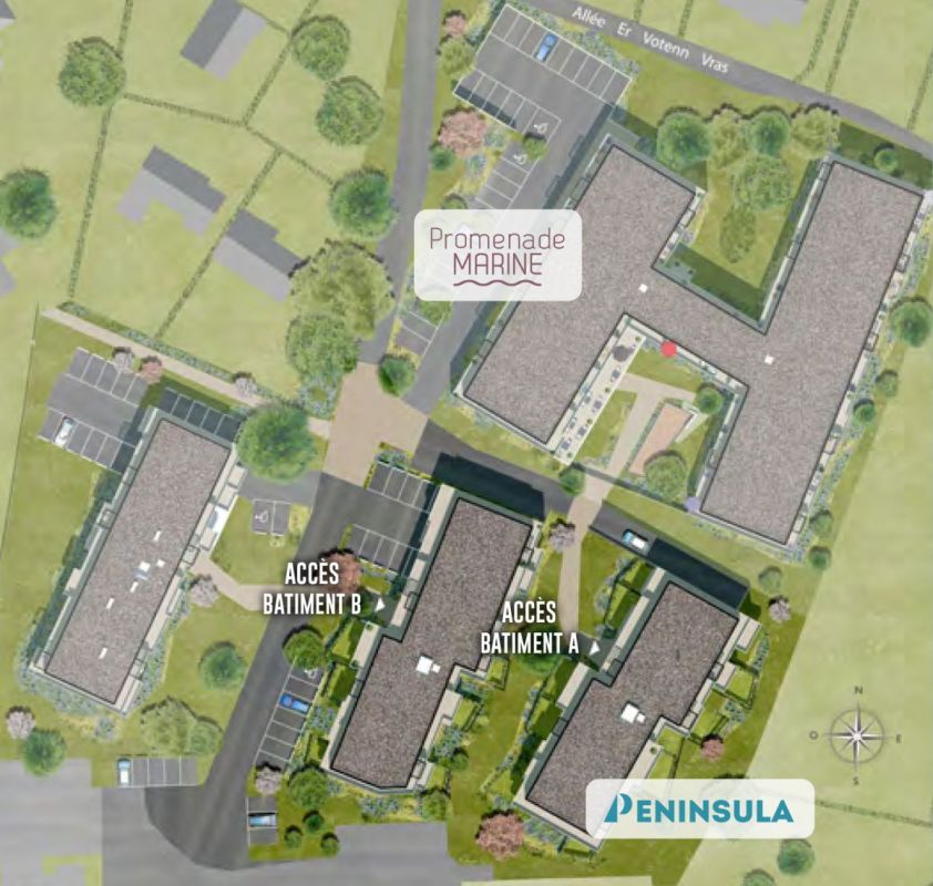 Allée Er Votenn Vras, à deux pas de l'église et des commerces de proximité, la résidence Peninsula évolue au cœur d'un environnement résidentiel et verdoyant.