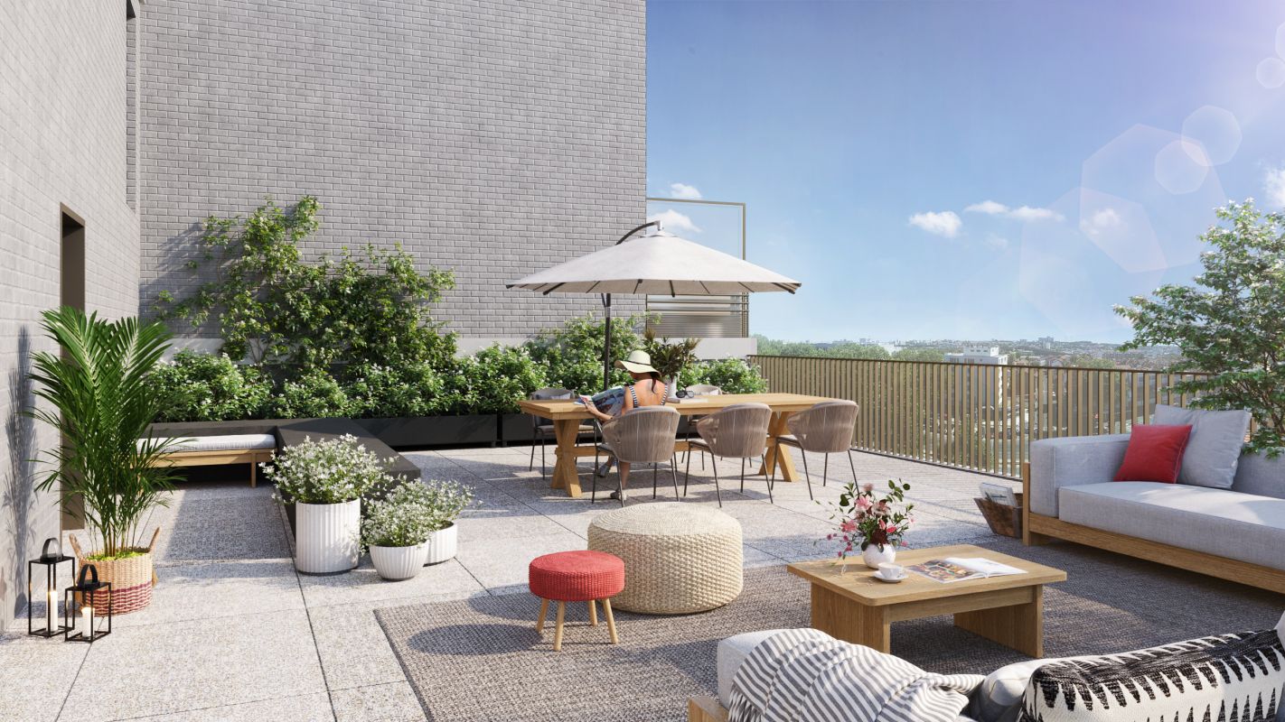 La réalisation se dessine à travers deux copropriétés et un cœur d’îlot paysagé. La plupart des logements bénéficient de grands espaces extérieurs, certains d’entre eux s’ouvrent sur de belles terrasses en cascade plein ciel.