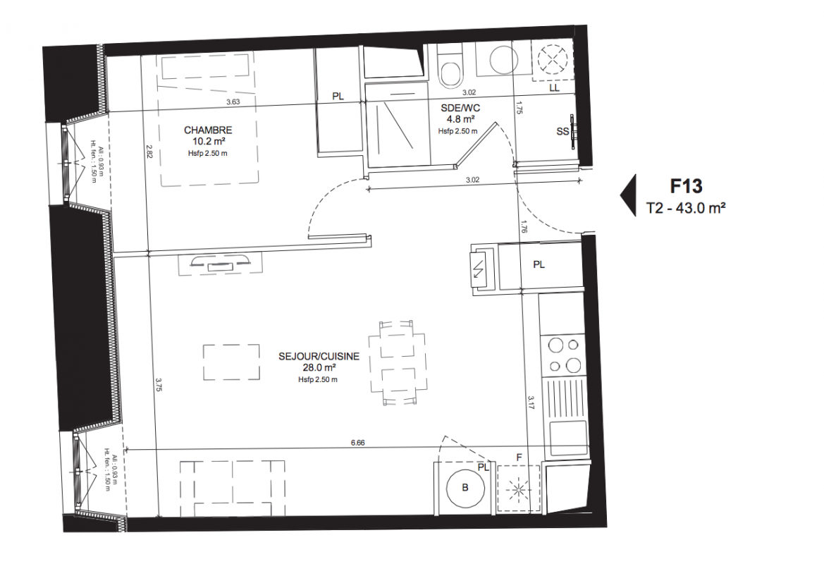 334 100€ Appt. T2 42.9m2 1er