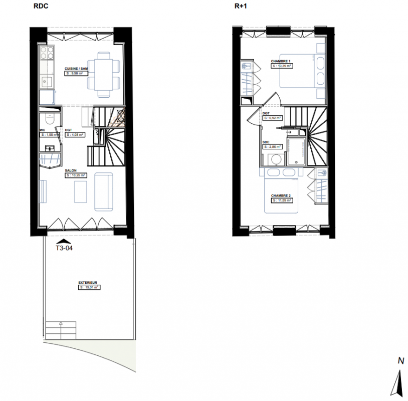 - Les typologies sont de type T1 ou T3 duplex et une maison T4 individuelle avec son jardin privatif