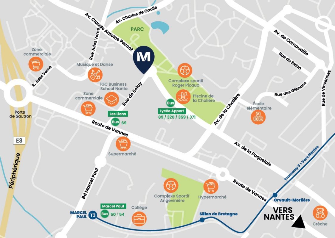 Achetez votre appartement neuf à Orvault Située à la lisière de Nantes Métropole, Orvault offre un équilibre parfait entre vie citadine et nature préservée. Implantés en plein cœur d'un quartier dynamique, nos appartements allant du 2 au 4 pièces bénéficient tous d'espaces extérieurs : jardins, balcons ou terrasses. Notre emplacement stratégique permet une proximité immédiate avec une zone commerciale accessible en seulement 2 minutes à pied, répondant à tous les besoins du quotidien. Pour les amateurs de sport, un complexe sportif complet, comprenant un stade, un gymnase et une piscine, se trouve à seulement 7 minutes à pied.La ville d'Orvault est desservie par un réseau de bus performant : l'arrêt de bus _ Les Lions _ de la ligne 69 est à 5 min à pied. Pour les déplacements inter-régionaux, la gare de Nantes est à 25 min en voiture, permettant de rejoindre rapidement des grandes villes comme Paris ou Rennes. De plus, les principaux axes routiers facilitent l'accès aux zones d'activités économiques environnantes. Contactez dès maintenant un de nos conseillers pour découvrir tous nos appartements neufs à Orvault !